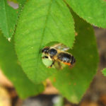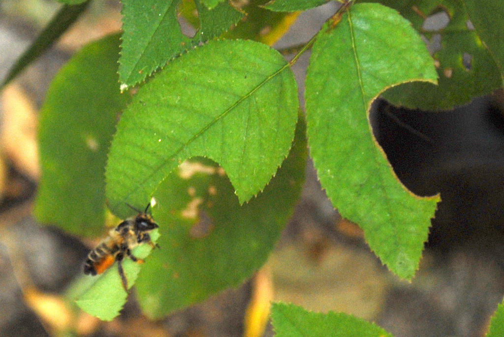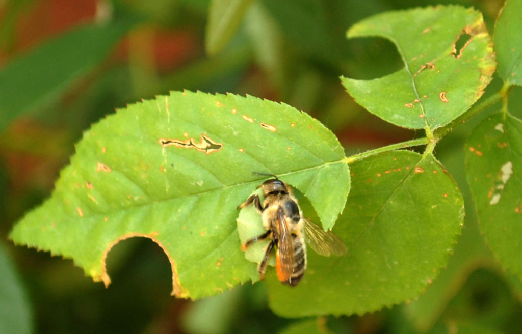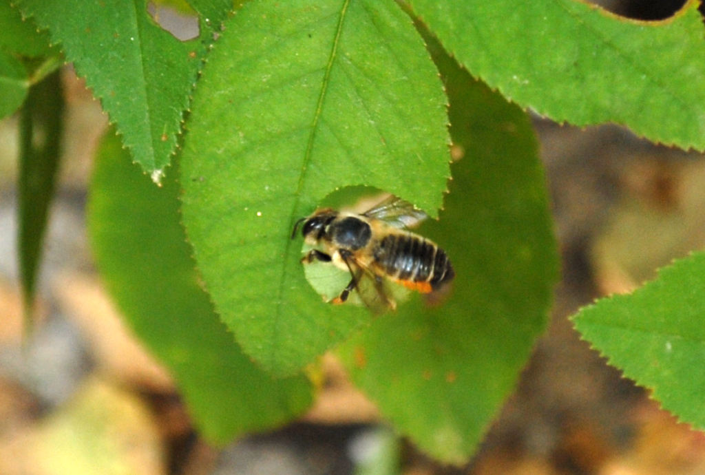 E’ la Megachile centuncularis è un’ape solitaria e abbastanza rara che ogni hanno forma la sua nursery utilizzando foglie di rosa botanica
