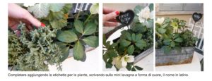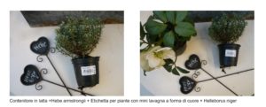 Completare aggiungendo le etichette per le piante, scrivendo sulla mini lavagna a forma di cuore, il nome in latino della pianta. In questo caso ho scelto di creare una composizione monocroma, ovvero sui toni del grigio, del verde glauco e del bianco, giocando con le dimensioni delle foglie, da grandi, quelle degli ellebori a piccole, quelle della hebe.
