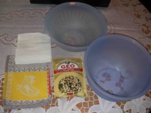 In serata ripetere l’azione almeno un’altra volta. Lasciate il telo umido sopra il vostro contenitore dove i germogli, senza acqua, inizieranno a germinare.