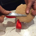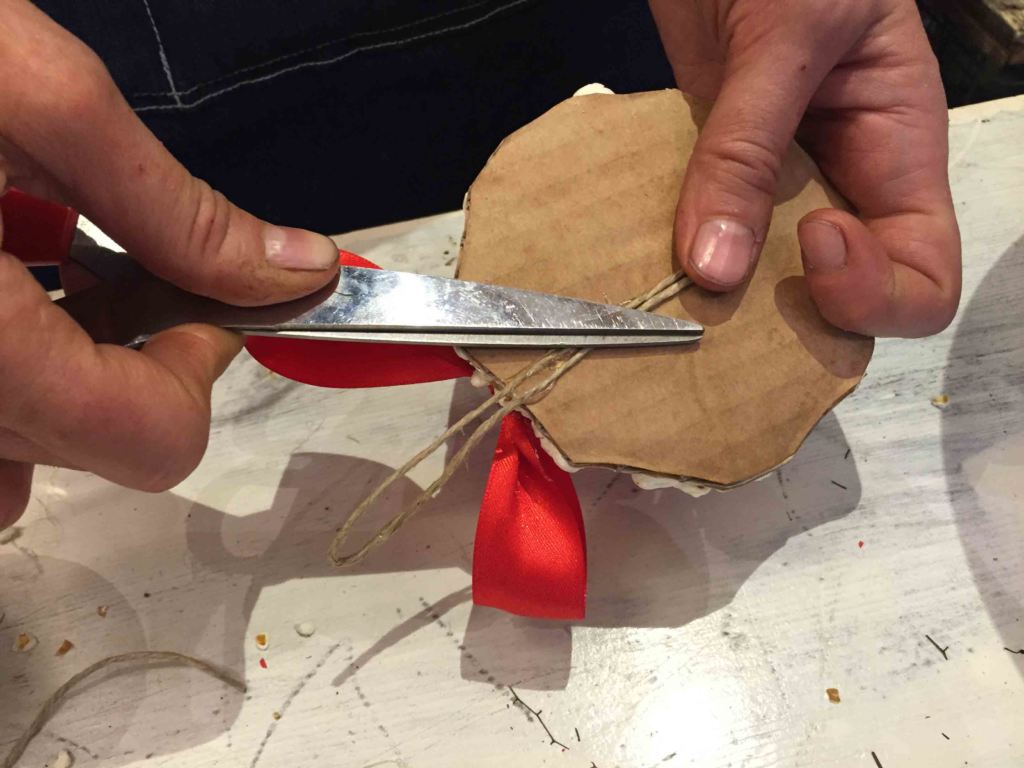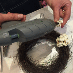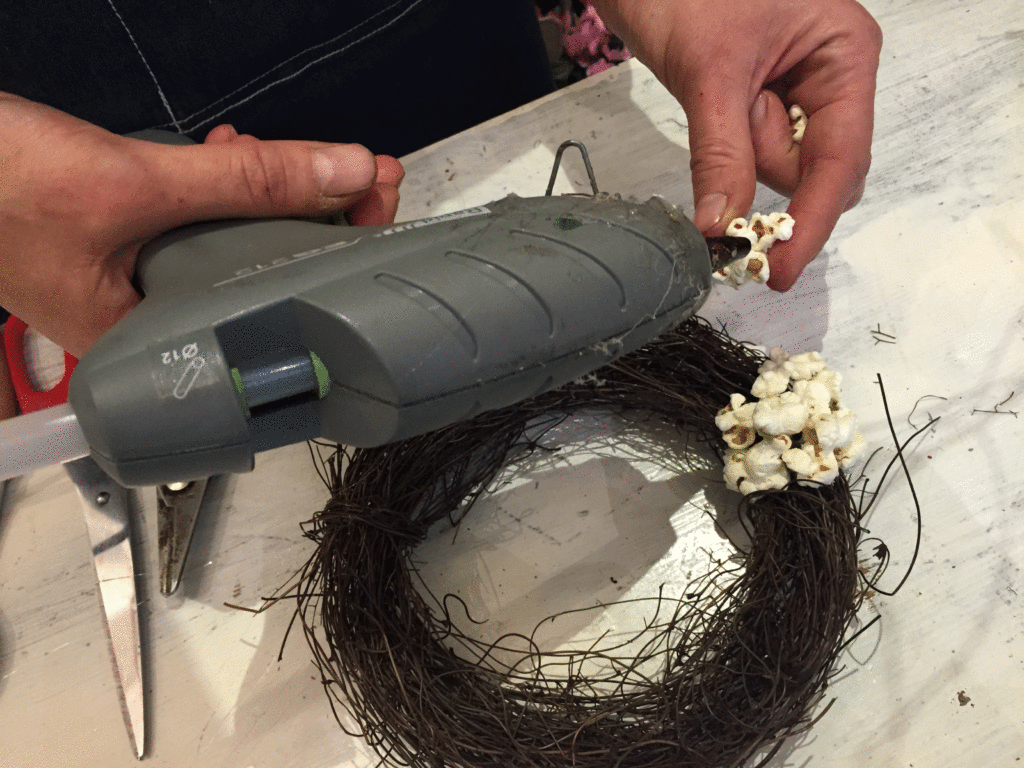 Facciamo scaldare la pistola con la colla a caldo facendo attenzione per tutto il periodo del montaggio che la punta brucia molto e deve stare lontana dalla portata dei bambini. Quindi si prende i popcorn uno ad uno e si incollano e con pazienza e attenzione andando a decorare la ghirlanda tenendo leggermente premuto l’addobbo finchè no si asciuga. Mettere i popcorn nella ghirlanda può diventare anche un gioco da fare con i bambini in quanto vanno scelti i pezzetti più adatti per essere attaccati uno sull’altro. ( Guarda il video per tutti i dettagli ) Questo può essere un lavoro lasciato ai bambini mentre gli adulti maneggeranno la colla a caldo. State molto attenti a non lasciare spazi vuoti seguendo l’andamento della ghirlanda. Mantenendo i popcorn premuti per un certo tempo siamo sicuri della miglior presa sulla ghirlanda. Il tempo di realizzazione di una ghirlanda di un diametro di 20 centimetri è di circa un’ora a seconda anche della manualità di chi vi lavora. La colla via via che si raffredda farà dei lunghi e antiestetici fili che potranno essere eliminati a fine lavoro senza problemi. Una volta completato il riempimento della ghirlanda di popcorn si passa alle decorazioni. Si cerca quindi di capire dove apporre il nastro rosso dopo aver fatto il fiocco e realizzato le punte.