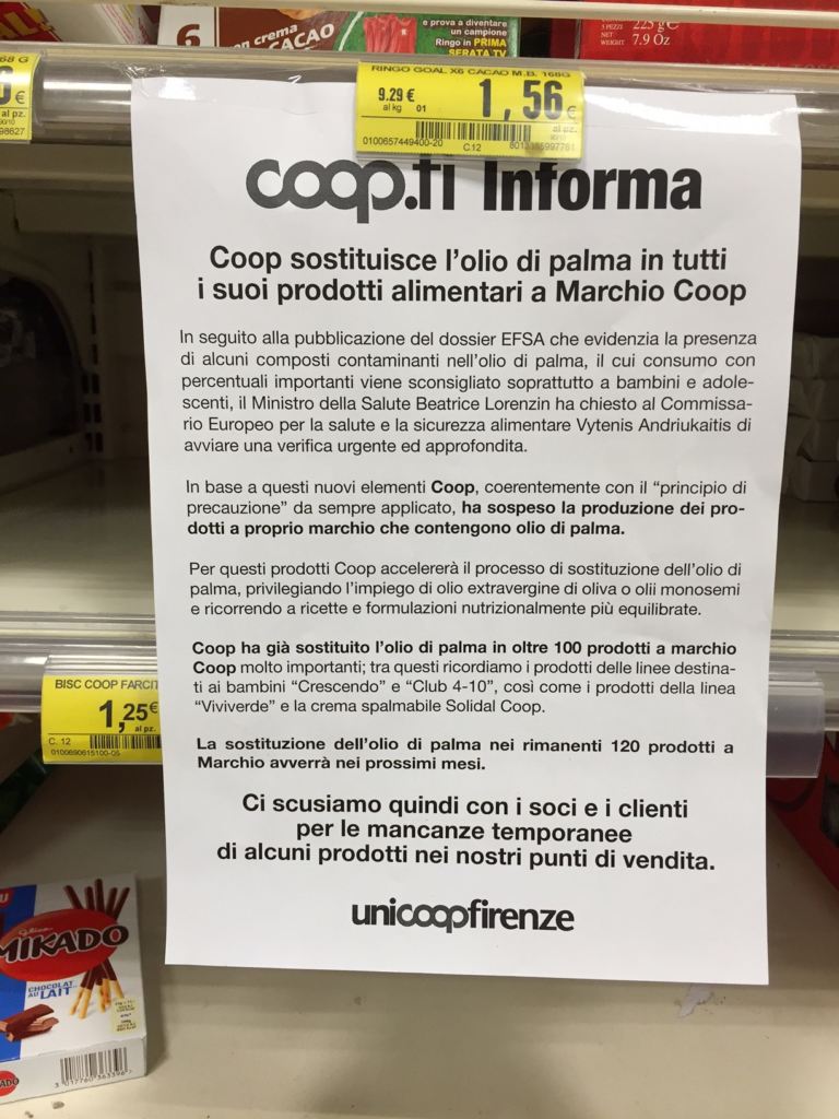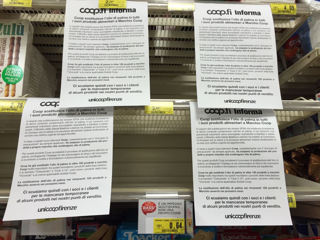 Gli scaffali della nota catena di distribuzione italiana, la Coop, sembrano appena usciti da un embargo. Da oggi, niente più prodotti a marchio Coop con l’olio di palma. Lo annunciano i volantini appesi negli scaffali vuoti. Si legge quindi: ” In seguito alla pubblicazione del dossier Efsa (Autorità Europea per la Sicurezza Alimentare, ndr) che evidenzia la presenza di alcuni composti contaminati nell’olio di palma, il cui consumo con percentuali importanti viene sconsigliato soprattutto a bambini e adolescenti, il Ministro della Salute Beatrice Lorenzin ha chiesto al Commissario Europeo per la salute e la sicurezza alimentare Vytenbis Sndriukaitis di avviare una verifica urgente e approfondita”.