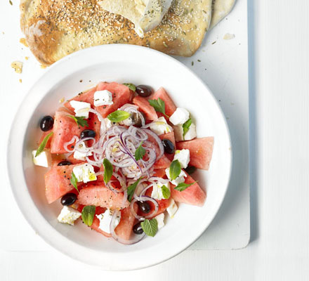 http://www.bbcgoodfood.com/recipes/11600/watermelon-and-feta-salad-with-crispbread