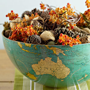 Avete un vecchio mappamondo di cui non sapete che fare? Allora tagliatelo a metà e riempitelo di pot-pourri: vedrete che fantastica decorazione profumata verrà fuori, ideale sia da sistemare al centro del tavolo oppure all’ingresso su un mobile.