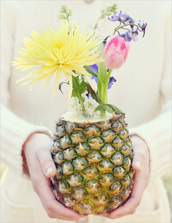 Volete create un centrotavola davvero sorprendente ideale per il periodo caldo come quello dell’estate? Allora prendete un’ ananas, svuotate l’interno e utilizzatelo per un succo, quindi inserite un bicchiere di vetro con all’interno una spugna ed aggiungete dell’acqua. Qui potrete applicare i vostri fiori preferiti.