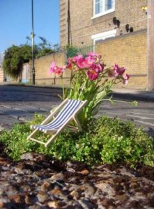 Un simpatico giardino in miniatura per riempire le buche nelle strade londinesi. I pedoni che si ritroveranno a passeggiare nel east side di Londra non rischieranno più di inciampare in una falla del terreno ma si fermeranno ad ammirare ciò che la mente del creativo Steve Wheen ha partorito in pieno stile guerrilla gardenig.
