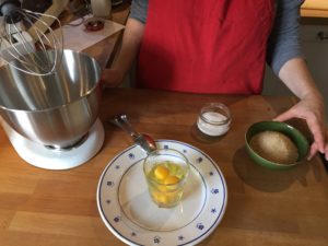 - Sgusciare le uova e metterle in un contenitore e aggiungerci lo zucchero poi mescolare o con il planetario o con la frusta