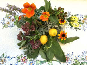 Centrotavola fai da te, un regalo d’estate che ci fa Simona Nannelli del Nel meriggio d’oro! Con erbe aromatiche e fiori del giardino tra le quali nasturzi,