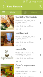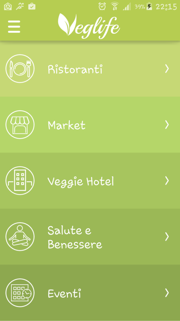 Aprendo l’app, si potrà navigare in un semplice menù con 5 categorie: ristoranti, market, veggie hotel, salute e benessere, eventi. Selezionando “Ristoranti” sarà possibile visualizzare tutti i locali vegan-friendly conosciuti in Italia e nel resto del mondo, mentre in “Market” si trova un elenco di cibi vegani, vegetariani, per crudisti, per intolleranti al lattosio, cibi senza glutine, biologici ma anche i punti vendita e i negozi di alimentari bio, detersivi e cosmetici cruelty-free, veg, o attenti all’ecologia. Per chi ama viaggiare, la sezione “Veggie hotel” suggerisce hotel e strutture che rimuovono uno stile di vita vegan e attento al rispetto della natura, mentre la categoria “Salute e benessere” è dedicata al benessere fisico e psicologico ed elenca erboristerie, centri yoga, centri benessere, e professionisti che praticano medicina olistica. Infine, per ampliare la propria cultura personale è stata creata la categoria “Eventi” dove è possibile trovare conferenze, convegni, appuntamenti, fiere, corsi inerenti al mondo vegan.